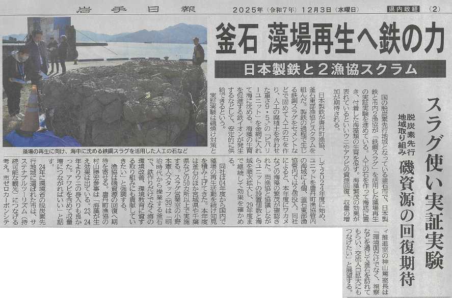 岩手県釜石市で進められている藻場再生に向けた実証実験に関する記事が、2025年12月3日付の岩手日報に掲載されました 。このプロジェクトにおいて、当社の製品が地域の磯資源回復という重要な環境保全活動に貢献しています。